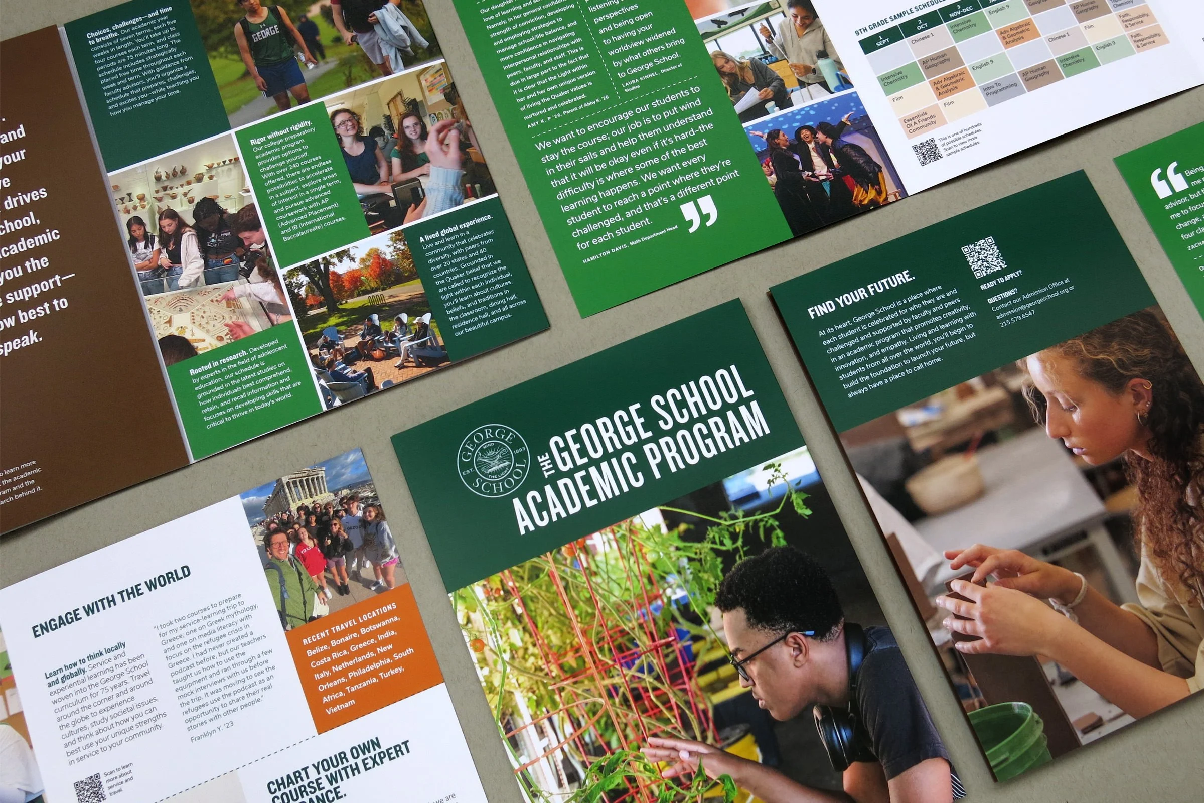 George School is not only my client, but also my neighbor. A Quaker, 9th-to-12th grade boarding and day school, its campus is where I’ve walked my dogs and one of my sons worked as a summer camp counselor. The gorgeous environment at George School is an ongoing inspiration from which to visually align my work, and the staff is supportive and open to new ideas. Together, we’ve produced admissions and advancement materials. We’re now creating a reimagined bi-yearly magazine.